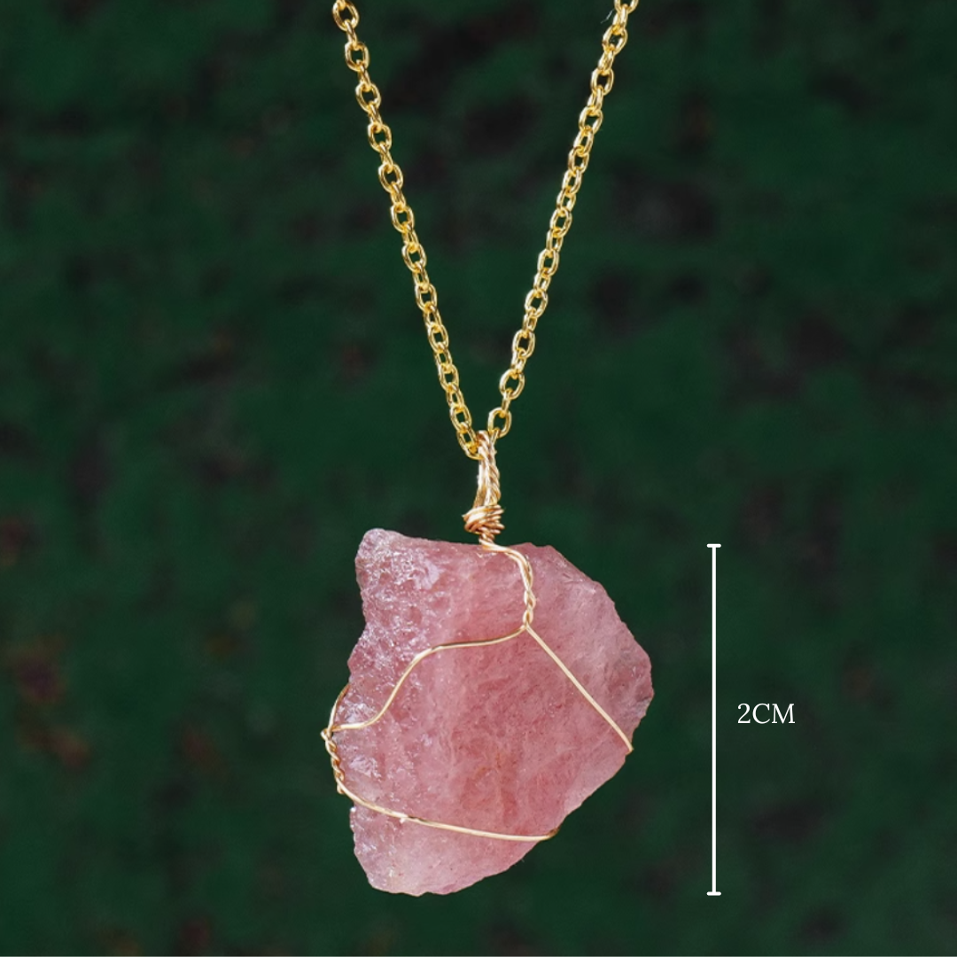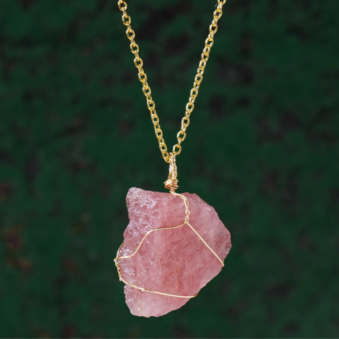 Collier en Quartz Fraise, idéal pour diffuser douceur et amour. Sa teinte délicate et sa chaîne dorée ajoutent une touche romantique et apaisante à votre style.
