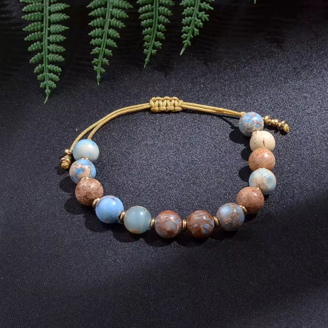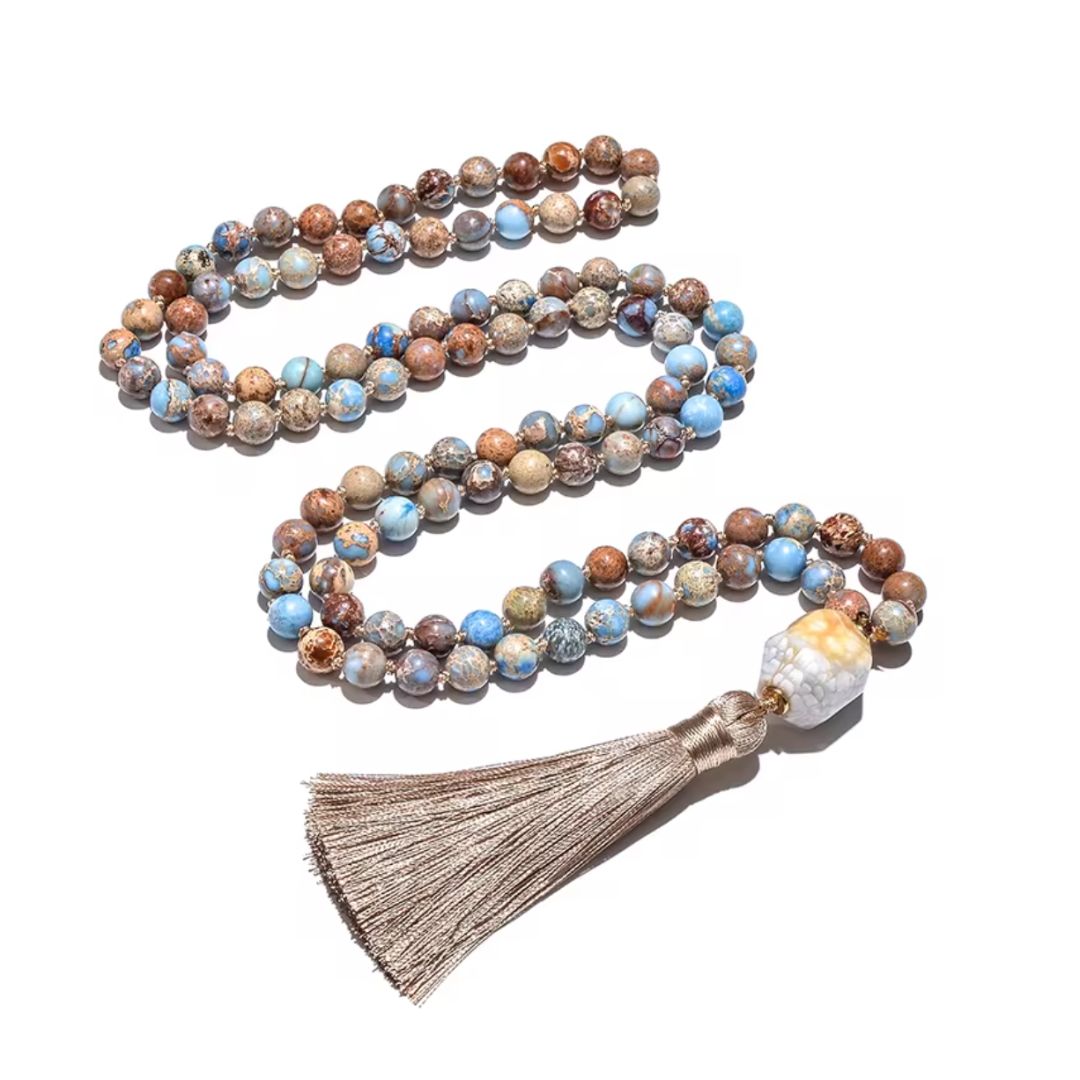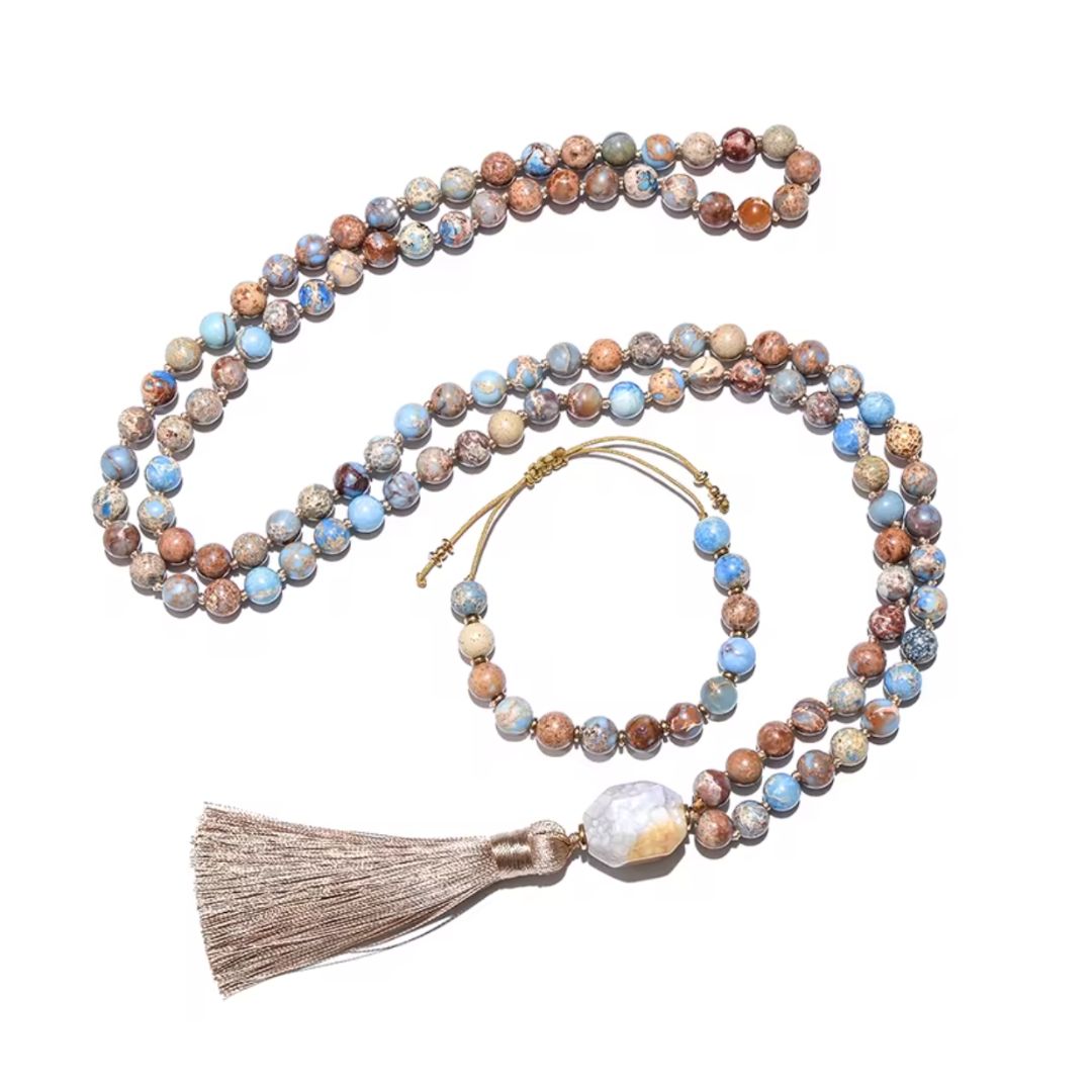 Ce mala est composé de 108 perles naturelles de jaspe impérial de 8 mm, aux nuances allant du brun, beige, bleu ciel au gris moucheté. Chaque perle révèle un paysage minéral unique, comme une invitation à se reconnecter à la nature. Le collier est terminé par une perle centrale irrégulière en pierre brute polie et un pompon beige doré, symbole d’ancrage et de fluidité. Le bracelet, ajustable grâce à un lien coulissant, offre un maintien confortable et élégant.