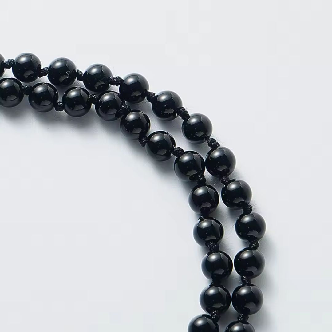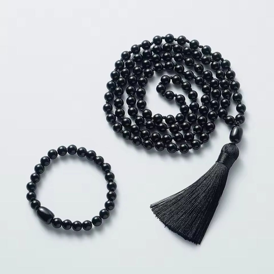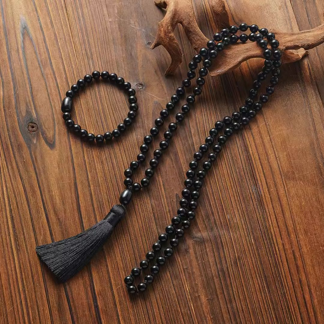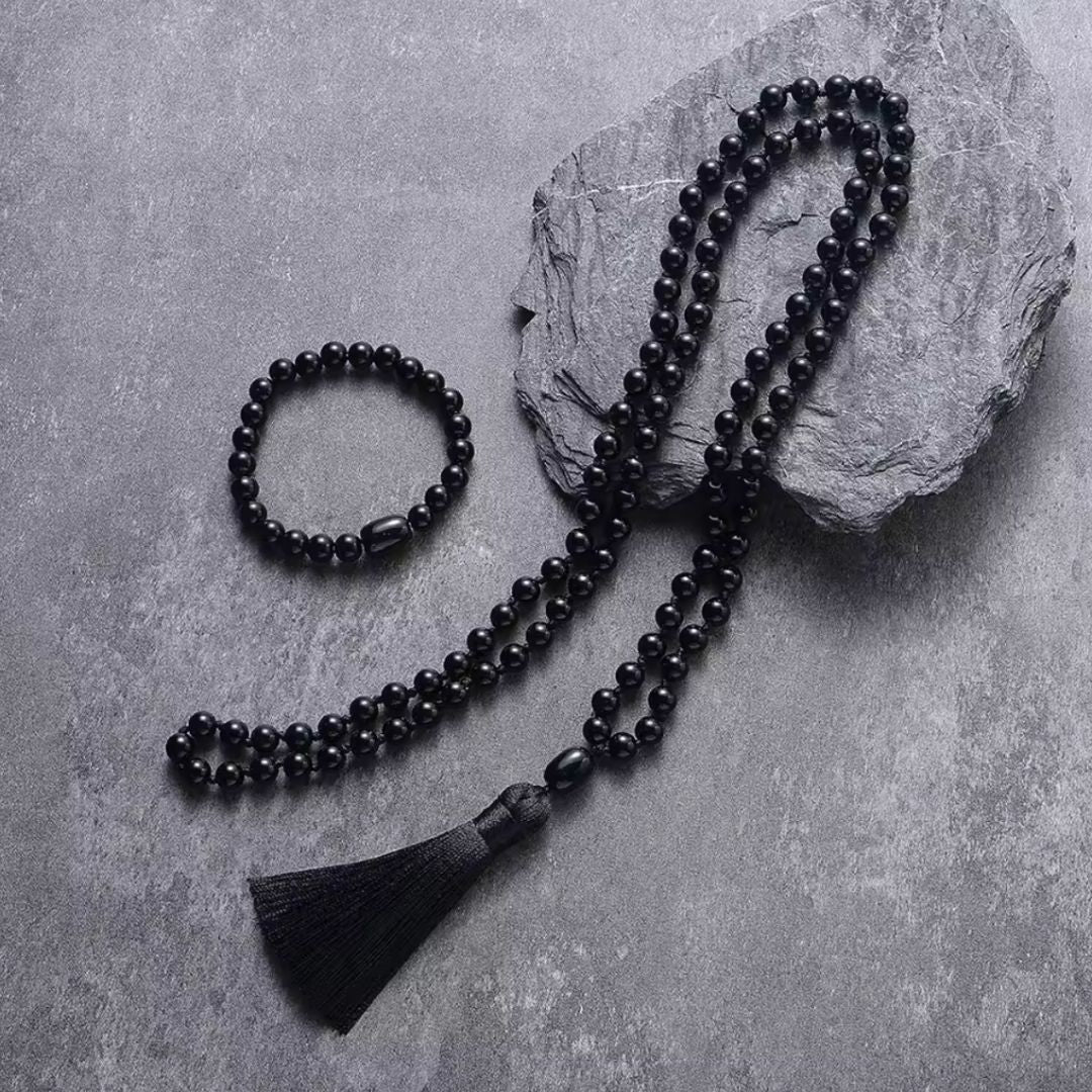 Le collier est composé de 108 perles rondes de 8 mm en onyx noir naturel, montées à la main sur un fil résistant. Il se termine par une perle centrale ovale et un pompon en soie noire de 8 cm, symbole de concentration et de fluidité. Le bracelet assorti, élastique et confortable, mesure environ 19 cm, ce qui lui permet de s’adapter facilement à la plupart des poignets.