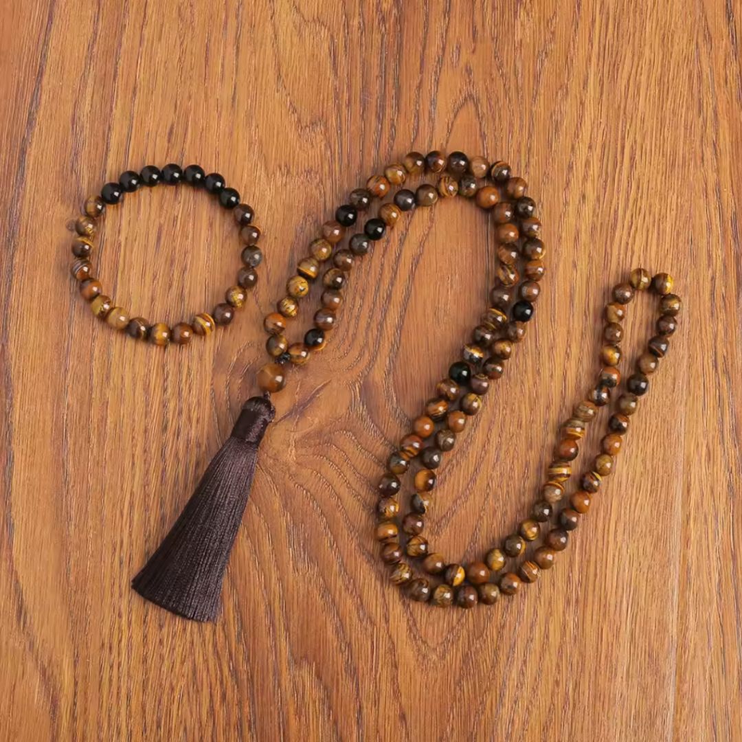 Avec ses 108 perles d'onyx noir et d'oeil de tigre, ce splendide collier mala est un bijou particulièrement protecteur et bienfaiteur. Il est le compagnon idéal des personnes qui recherchent à développer leur spiritualité ou à profiter des bienfaits des pierres naturelles.