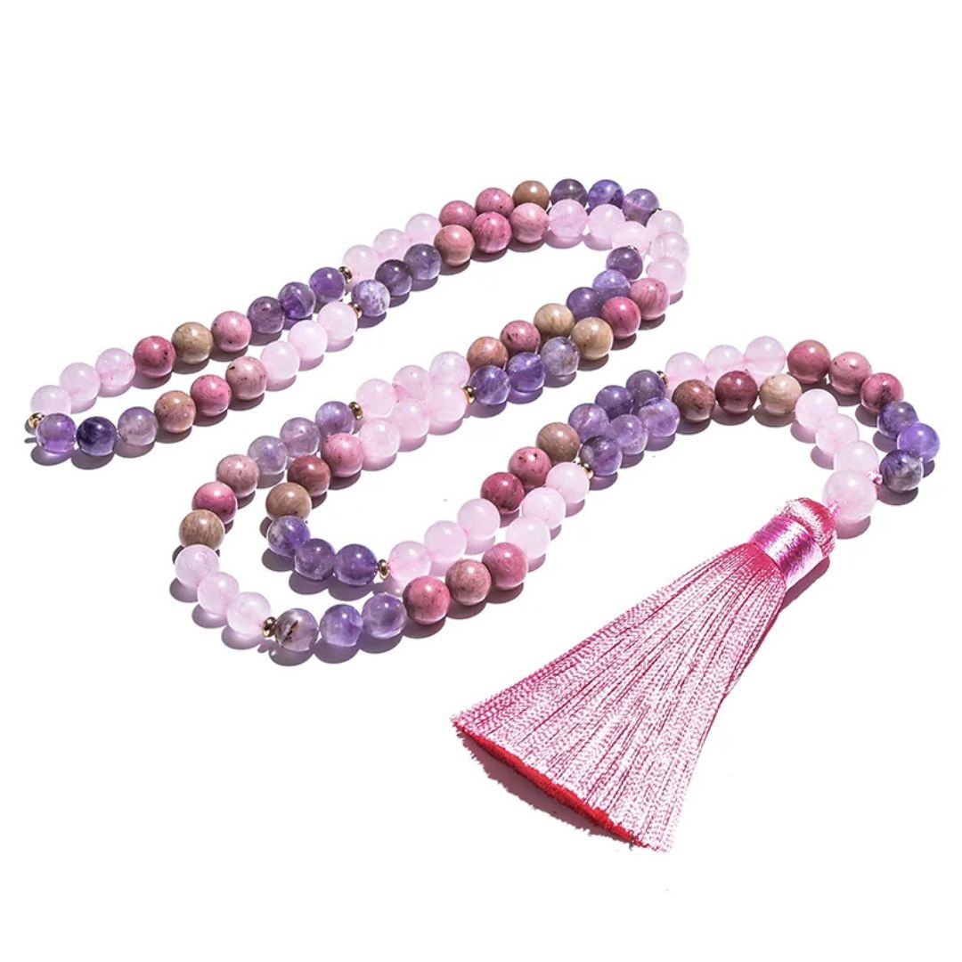Ce collier mala en rhodolite, accompagné de son bracelet assorti offert, incarne l’harmonie du cœur, la douceur intérieure et la puissance de transformation émotionnelle. Chaque perle naturelle de 8 mm est soigneusement sélectionnée pour sa qualité vibratoire et ses couleurs profondes, oscillant entre le rose framboise, le prune et le lilas, offrant une esthétique à la fois féminine et spirituelle.