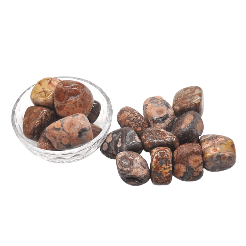 Pierre d'une très grande originalité, le jaspe léopard est une variété de jaspe orbiculaire qui se caractérise par ses ravissants motifs laissant penser au pelage du félin. Aussi connu en tant que "Léopardite" ou "Rhyolite", il affiche généralement des couleurs brunes, orangées et crèmes. Le jaspe léopard était autrefois utilisé par les chamans amérindiens qui s'en servaient pour rentrer en contact avec leurs animaux totems.